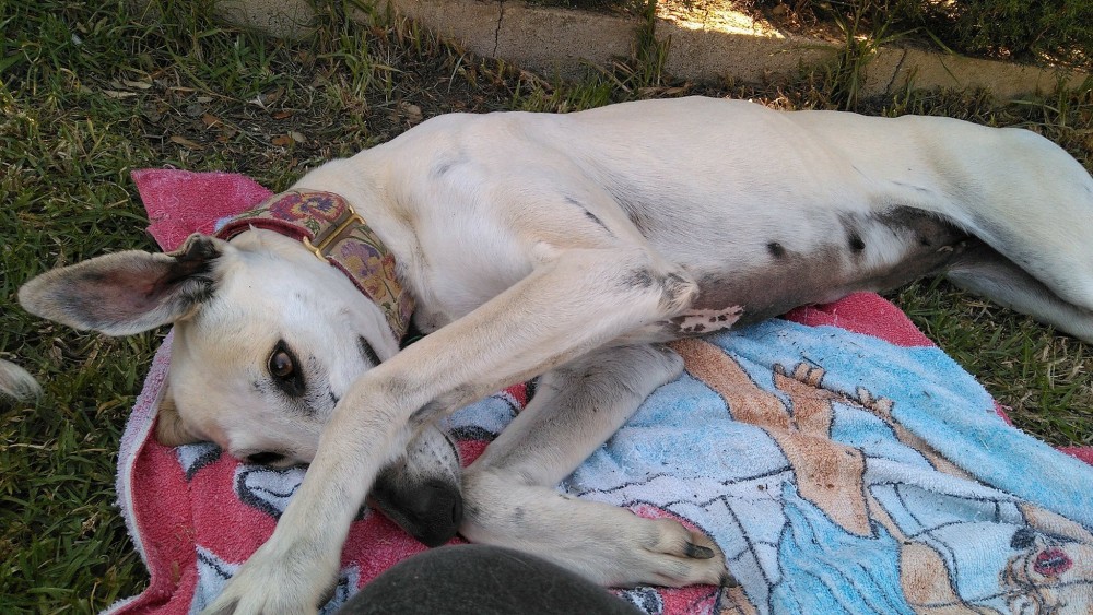 A Duna la encontró una voluntaria una fría mañana de Enero en las calles de un pueblo, muy delgada y sucia, se refugiaba bajo los coches del frío y buscaba comida en la basura. Solo basto enseñarle un salchicha y Duna acudió mimosa a su salvación.